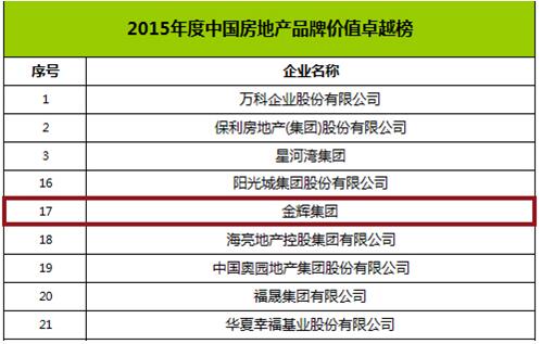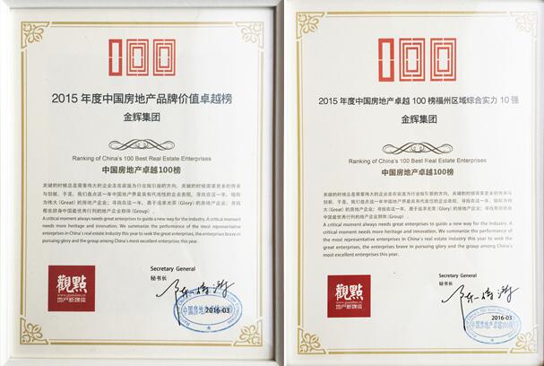 2016年3月22日,在剛剛結(jié)束的2015年度中國房地產(chǎn)卓越榜發(fā)布會上,金輝集團(tuán)榮膺 “年度中國房地產(chǎn)品牌價值卓越榜17強(qiáng)”、“年度中國房地產(chǎn)卓越100榜36強(qiáng)”、 “福州區(qū)域綜合實力10強(qiáng)榜8強(qiáng)”三項榮譽。